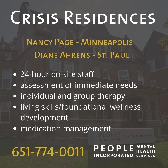 People Incorporated Diane Ahrens Crisis Residence is a mental health treatment center for people seeking treatment near Ramsey County. As part of their treatment modalities for recovery, People Incorporated Diane Ahrens Crisis Residence provides couples/family therapy, group counseling, and cognitive behavioral therapy during treatment. People Incorporated Diane Ahrens Crisis Residence is located in Saint Paul, Minnesota, accepting cash or self-payment for treatment.